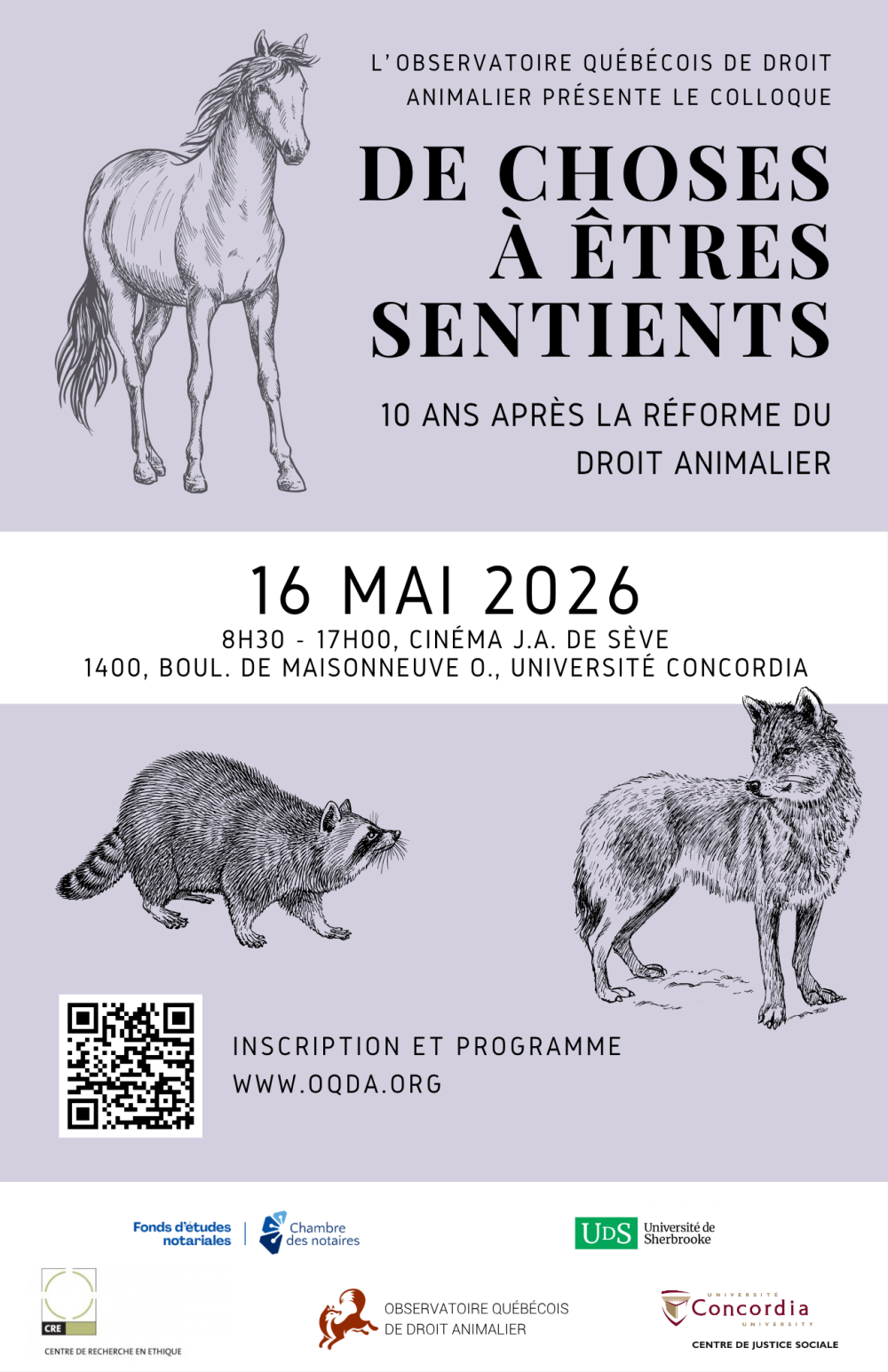 L’Observatoire québécois de droit animalier vous convie avec plaisir à son tout premier colloque! Le colloque proposera un bilan des 10 ans suivant la réforme du droit animalier de 2015 qui, sur le plan juridique, a fait passer les animaux de choses à être sentients.