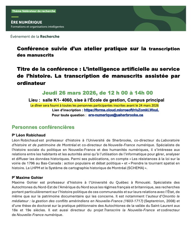 Les professeurs Léon Robichaud et Maxime Gohier donneront une conférence suivie d’un atelier pratique sur la transcription des manuscrits à l’Université de Sherbrooke le 26 mars prochain. Le dîner sera fourni à toutes les personnes participantes inscrites avant le 24 mars 2026 (formulaire en ligne).