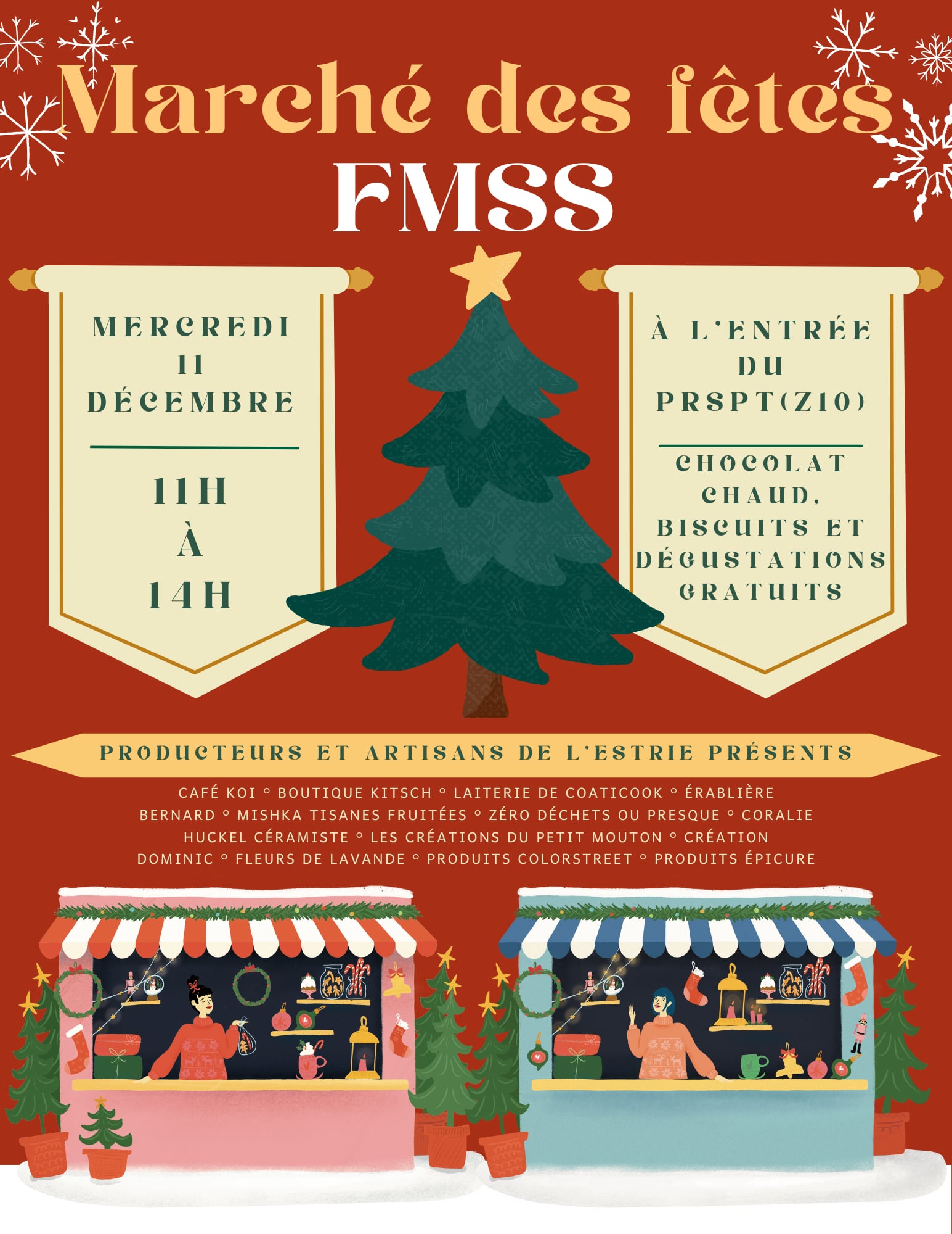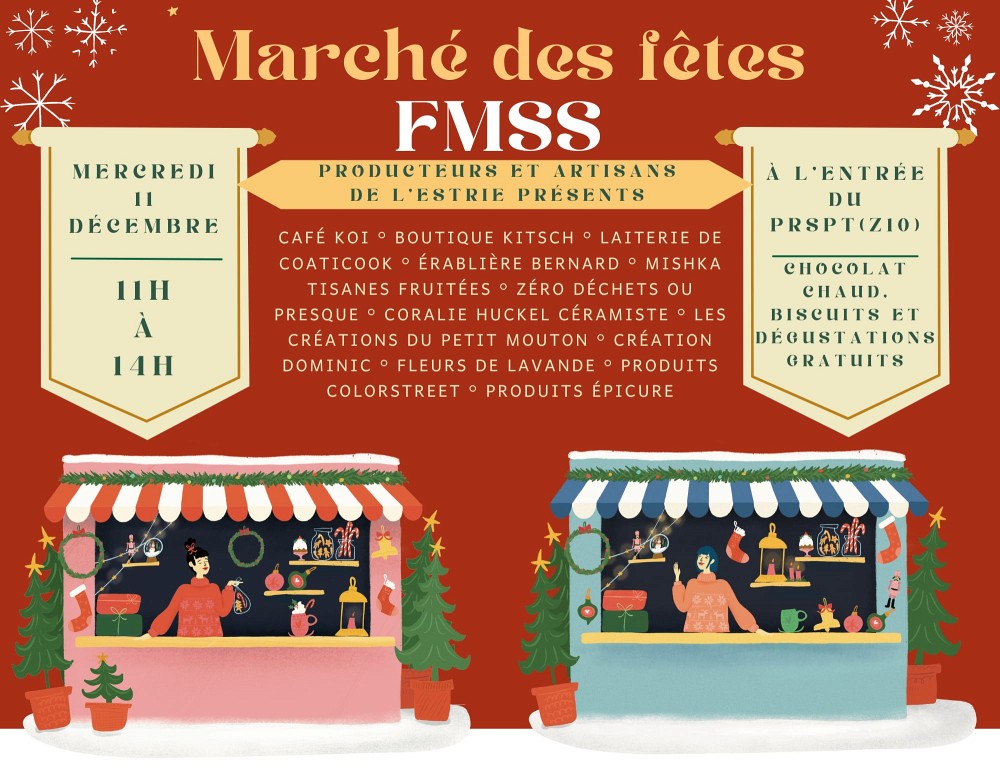 Venez faire une pause bien méritée et plongez dans l'ambiance chaleureuse des Fêtes tout en découvrant une grande sélection de producteurs, artisans et commerces locaux de la région de l'Estrie. 12 kiosques seront sur place cette année! C'est l'occasion rêvée de trouver des cadeaux de Noël uniques tout en soutenant l'économie locale, directement sur le campus de la santé.