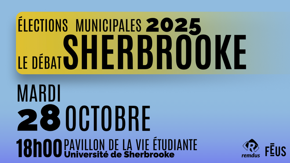 La FEUS et le REMDUS ont le plaisir d’inviter la communauté sherbrookoise à son débat du mardi 28 octobre à 18 h au pavillon de la Vie étudiante de l’Université de Sherbrooke dans le cadre des élections municipales 2025!