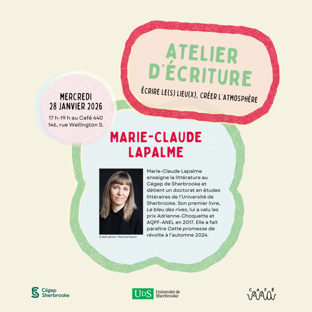 Les ateliers sont une initiative de Kiev Renaud, professeure au Département des arts, langues et littératures (DALL) de l’Université de Sherbrooke, qui vise à rassembler des écrivaines et écrivains, des enseignantes et enseignants, des étudiantes et étudiants ainsi que des diplômées et diplômés autour de la création littéraire. Ce projet est appuyé par la Faculté des lettres et sciences humaines.