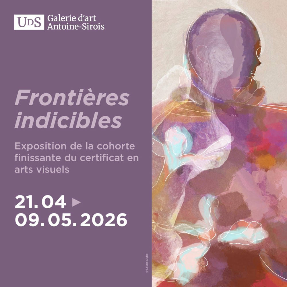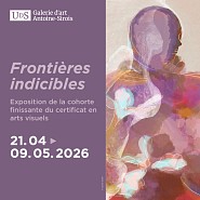La Galerie d'art Antoine-Sirois présente l'exposition des artistes étudiantes et étudiants du certificat en arts visuels, intitulée Frontières indicibles, en coproduction avec le Département des arts, langues et littératures. Neuf étudiantes et un étudiant y proposent des œuvres inédites autour de sujets et d'enjeux actuels dans des techniques et médias variés : installation, peinture, photographie, sculpture, vidéo, etc.