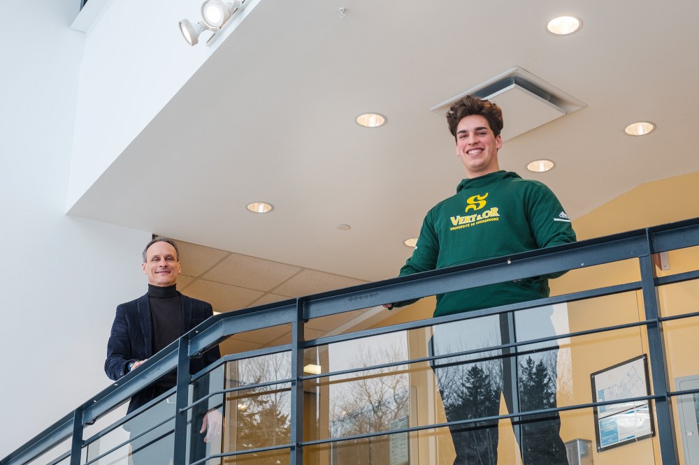 Édouard St-Amand (à droite) se joint à l’équipe de football Vert & Or de l’UdeS. Il bénéficie d'une bourse créée par le Pr Jean Roy (à gauche), couvrant la totalité de ses frais de scolarité.