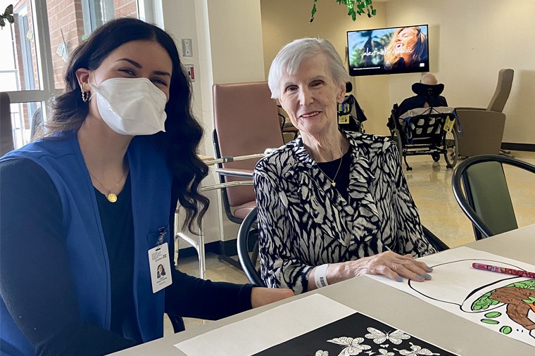 Arianne Turcotte-Poulin, étudiante au baccalauréat en service social, et la résidente du CHSLD d'Argyll, Mme Huguette Turgeon, alors qu'Arianne effectuait sa dernière journée de bénévolat auprès de Mme Turgeon.