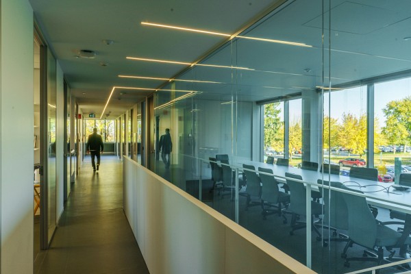 Conçu par Saucier + Perrotte Architectes, le nouveau pavillon offre des espaces réfléchis pour les diverses personnes qui y travaillent au quotidien, mais aussi en fonction de notre mission universitaire. Ce qui est le plus frappant lorsqu’on visite ces lieux, c’est la transparence créée par la présence des nombreuses fenêtres qui permettent de baigner de lumière naturelle tous les espaces, donnant accès au paysage extérieur peu importe où l’on se situe. Le nouveau salon du personnel, qui est vite devenu un lieu de rassemblement privilégié, offre d’ailleurs une vue imprenable sur le mont Orford. On trouve de plus dans ce pavillon des salles de rencontre dont bénéficiera l’ensemble de la communauté.