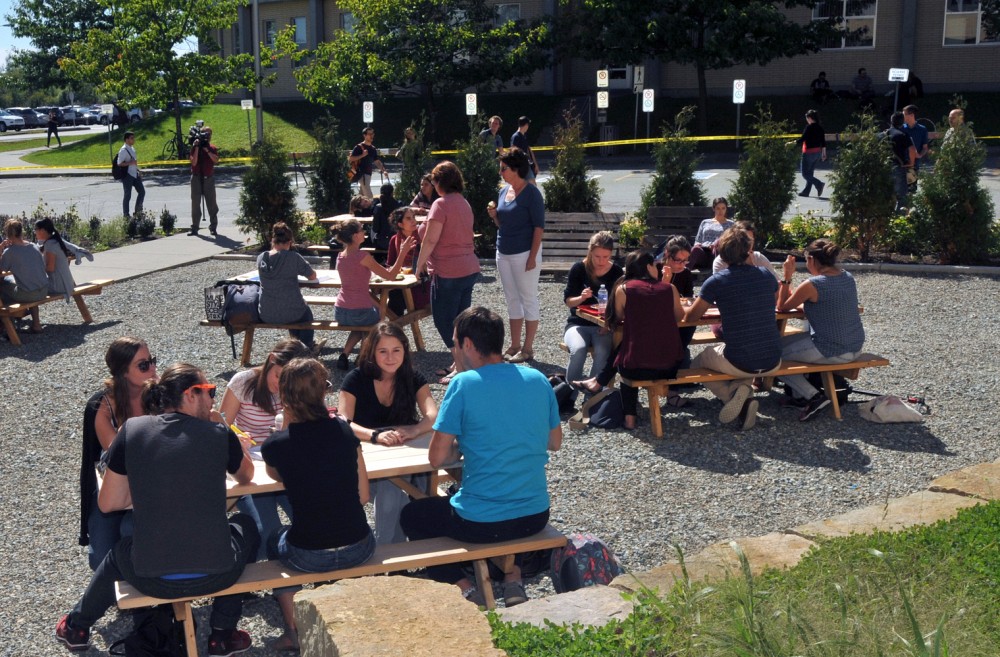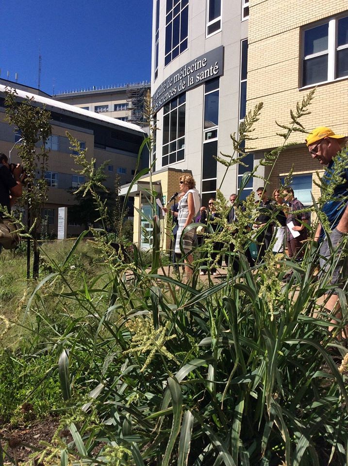 «Sous les pavés, la plage!» scandaient les étudiants en France en mai 1968. En 2016, à la Faculté de médecine et des sciences de la santé, le slogan pourrait fort bien être : «Sous le bitume, le jardin!» Ce qui était l’an dernier un stationnement gris, un îlot d’asphalte, est maintenant devenu un lieu de rassemblement où étudiants, professeurs et membres du personnel pourront échanger et partager un repas au milieu de plantes, fleurs et arbres fruitiers. Une cinquantaine d’entre eux étaient rassemblés pour souligner l’inauguration qui, à la suite d’un concours lancé auprès des étudiants, portera désormais le nom de Jardin Zen 7.