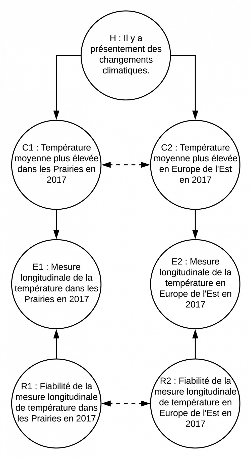 Les outils formels de l’épistémologie bayésienne permettent de répondre à cette question en modélisant la situation d’enquête scientifique à l’aide d’un réseau bayésien (fig.1). Une flèche pleine entre deux nœuds représente un lien de cause à effet, tandis qu’une flèche pointillée représente une indépendance partielle entre deux nœuds. Dans le réseau de Claveau et Grenier, on retrouve l’hypothèse H, les conséquences observables C de l’hypothèse et la fiabilité R des sources qui produisent des éléments probants E.
