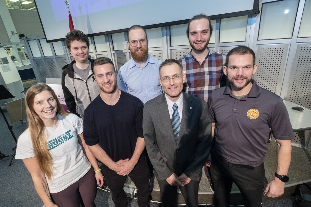 Le professeur Eric Goulet entouré de ses étudiantes et étudiants à la maîtrise et au doctorat et de son assistant de recherche, Martin Lamontage-Lacasse, également réserviste avec les Fusilliers de Sherbrooke.
