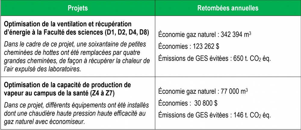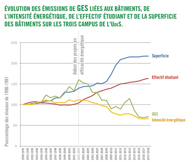 Ces performances s'inscrivent dans un contexte où l'Université a connu, pour la même période, un développement majeur en enseignement et en recherche avec une augmentation de 57,5 % de l'effectif étudiant (EETP) et de 55,1 % de la superficie des bâtiments des trois campus. Les projets réalisés ont engendré des économies d’énergie récurrentes annuelles aujourd’hui estimées à plus de 3,5 M$.