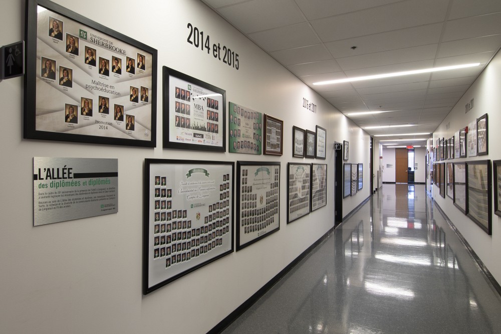 Que vous ayez complété vos études en administration, en droit, en psychoéducation ou en sciences infirmières, vous pourrez désormais admirer avec fierté l’empreinte de votre parcours universitaire en visitant L’Allée des diplômées et des diplômés, située au 3e étage, dans le corridor près de L’Agora.