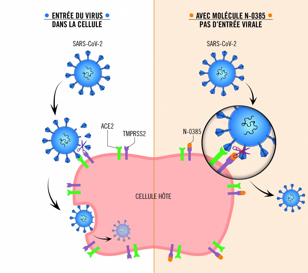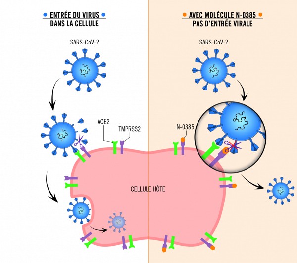 Ainsi, en bloquant l’activité de l’enzyme TMPRSS2, celle-ci ne coupe plus le spicule, qui ne peut plus exposer son peptide de fusion. Le virus ne pouvant pas entrer dans la cellule, la N-0385 agit comme un antiviral en bloquant l’entrée cellulaire.