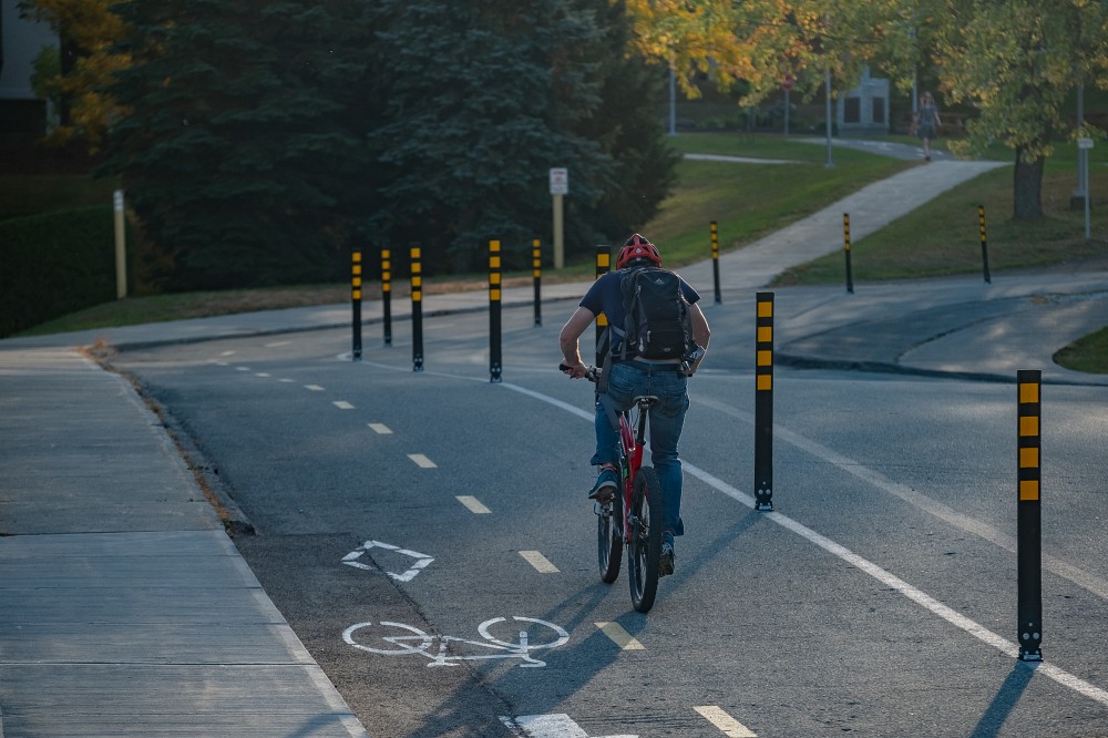 Si elle reconnaît que certains aspects peuvent sembler des défis lorsque vient le temps d’enfourcher sa monture pour aller au travail – manque d’infrastructures, sécurité, hygiène, relief du territoire sherbrookois –, elle ajoute que plusieurs leviers intéressants sont en place à l’UdeS pour faciliter ce transfert modal. Supports à vélos et stationnements sécurisés, bornes de réparation, bicyclettes en libre-service et douches disponibles dans plusieurs bâtiments figurent parmi les infrastructures et services présents sur les trois campus.