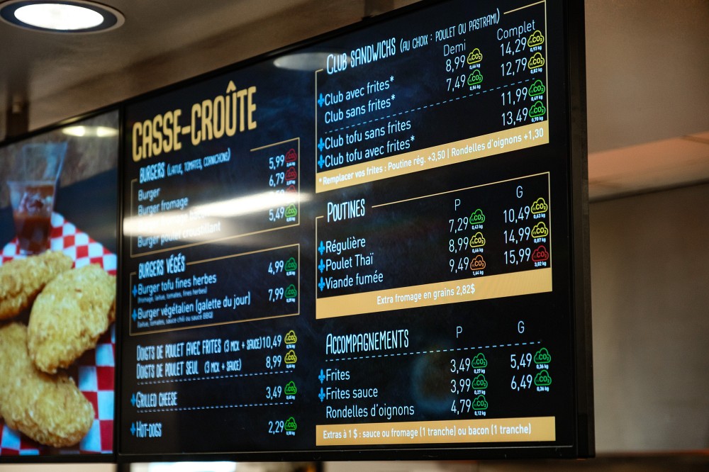 Le nouvel affichage mis en place dans les cafétérias de Café CAUS repose sur des repères visuels simples et efficaces : des nuages de CO₂ avec un code de couleurs pour illustrer l’empreinte carbone des plats et une fleur de lys pour identifier les repas préparés avec des ingrédients locaux.