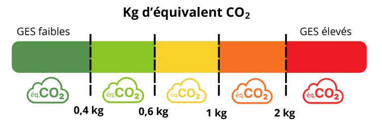 Notamment, cet affichage nous rappelle dès le premier coup d’œil que les protéines animales, en particulier le bœuf, sont globalement plus émettrices que les protéines végétales.