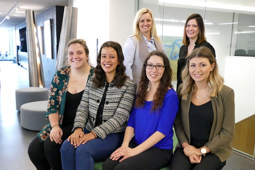 À l'arrière : Me Déborah Montambault-Trudelle, Marie-Claude Desjardins, professeure et cosuperviseure de la Clé de vos droits. À l'avant : Jacynthe L’Espérance-Hamel (Droit), Josianne Dufresne (Droit), Estel Blanchet (Travail social) et Shanny St-Onge (Travail social). Absents de la photo : Véronique Fortin, professeure et cosupervieure de la Clé de vos droits, Guillaume Rousseau, professeur et cosuperviseur de la Clé de vos droits, et Annie Lambert, professeure et cosuperviseure du projet.