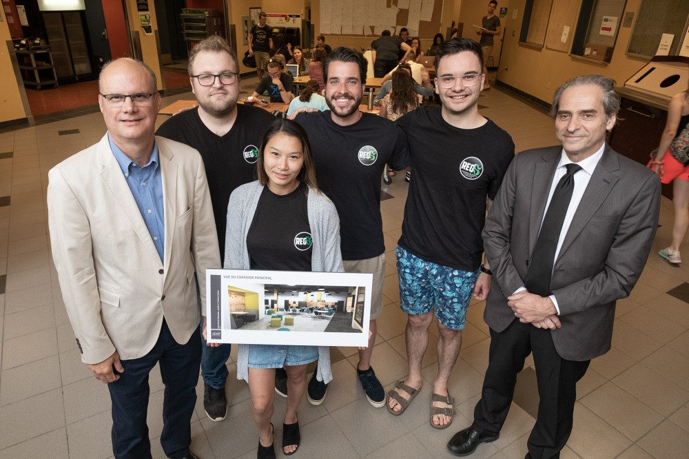 Dans le cadre de la campagne de financement majeure de la Fondation de l’Université de Sherbrooke, le professeur François Coderre, doyen de l’École de gestion, a annoncé lors d’une brève cérémonie tenue récemment en compagnie de quelques membres du Regroupement des étudiants de l’École de gestion de Sherbrooke (REGS) que les étudiantes et les étudiants de premier cycle de l’École de gestion ont accepté de prolonger les contributions consacrées à l’amélioration de leurs espaces de vie, jusqu’en 2026, et ainsi renouveler l’entente avec la Fondation pour une nouvelle période de 5 ans.