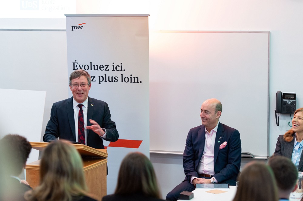 Au nom de toute la communauté de l’École de gestion, je tiens à remercier Nicolas Marcoux et les associés de PwC Canada pour leur soutien qui contribue au développement de notre faculté et à la réussite de nos étudiantes et de nos étudiants. Nous sommes heureux de célébrer ce moment avec vous et de nommer l’Auditorium PwC en votre honneur afin de laisser un symbole bien vivant de votre générosité et de votre leadership engagé à l’endroit de votre alma mater.