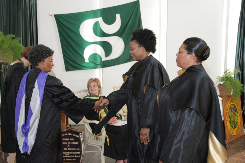 Les nouveaux diplômées et diplômés ont été officiellement investis des couleurs de l'Université de Sherbrooke, en retournant leur cape noire pour se couvrir d'or et de vert, en présence de quelque 300 invités, principalement leur entourage venu des quatre coins du pays. Il va sans dire qu’une telle collation des grades revêt pour ces étudiantes et étudiants une très grande importance, étant hautement symbolique. Aux dires de la marraine, Madame Edmonde Supplice Beauzile, et du parrain, Monsieur Kelly C. Bastien, de cette promotion qui a choisi le nom de Paolo Freire, ce sont autant d’agentes et d’agents qui œuvreront à la transformation de leur pays par l’éducation.