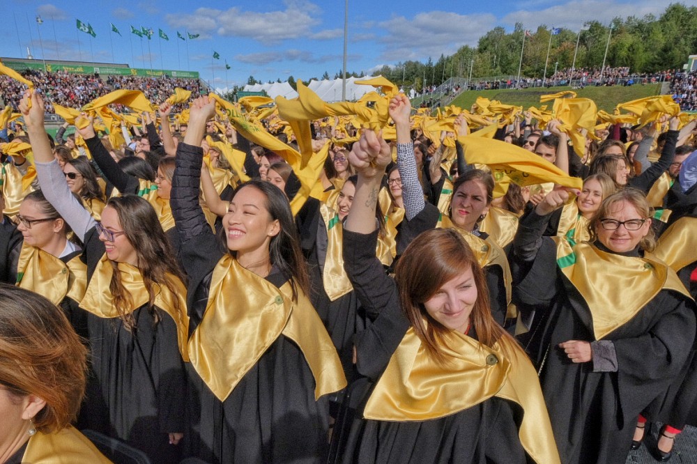 C’est devant une assistance de plus de 12 000 personnes que les nouveaux diplômés de l’Université de Sherbrooke ont retourné simultanément leurs capes samedi, au stade extérieur, pour célébrer leur réussite en vert et or. Établissant un record de participation depuis les débuts de la collation des grades, 2 983 finissants sont venus recevoir leur diplôme en mains propres et ont ainsi été investis des couleurs officielles de l’UdeS.