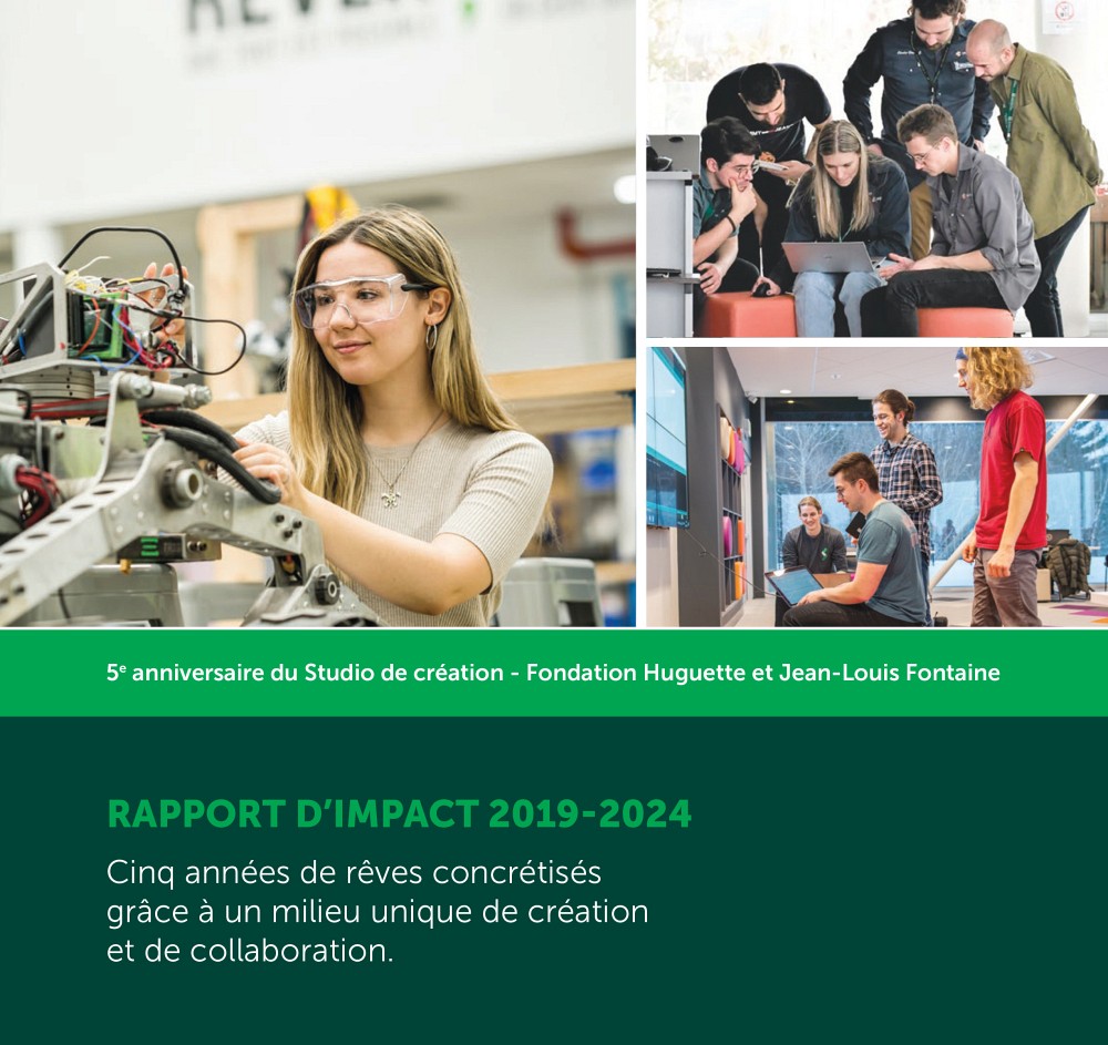 En 2019, nous inaugurions le Studio de création - Fondation Huguette et Jean-Louis Fontaine, un espace conçu pour transformer les idées en réalisations concrètes. Cinq ans plus tard, le bilan est impressionnant : des centaines d’étudiantes et étudiants ont pu bénéficier d’équipements de pointe, propices à l’innovation, à la collaboration et à l’entrepreneuriat pour réaliser leurs projets. Plus qu’un lieu, le Studio est un catalyseur d’idées et un tremplin pour les talents de demain.