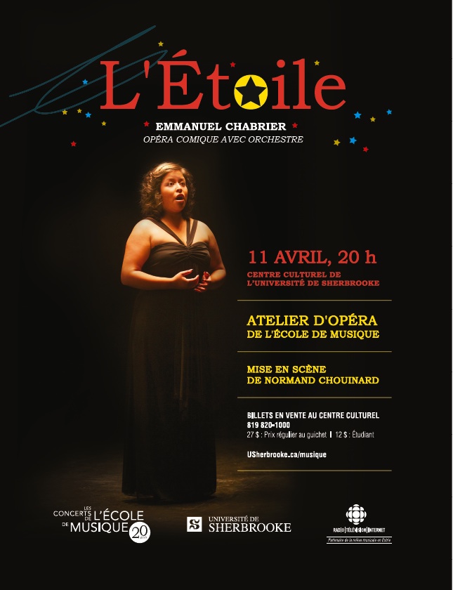 Le jeudi 11 avril à 20 h au Centre culturel de l’Université de Sherbrooke, l’École de musique présente L’Étoile, le célèbre opéra-bouffe en trois actes du grand compositeur Emmanuel Chabrier (1841-1894). Les décors fantasques et les costumes loufoques empruntés au prestigieux Opéra de Montréal contribuent à la verve comique de cette grande production lyrique et théâtrale offerte annuellement au grand public. Une heure et demie de pur divertissement, au cœur d’un royaume de bouffonnerie, mettant fièrement en vedette un cinquantaine d'étudiantes et d'étudiants de l'École de musique.