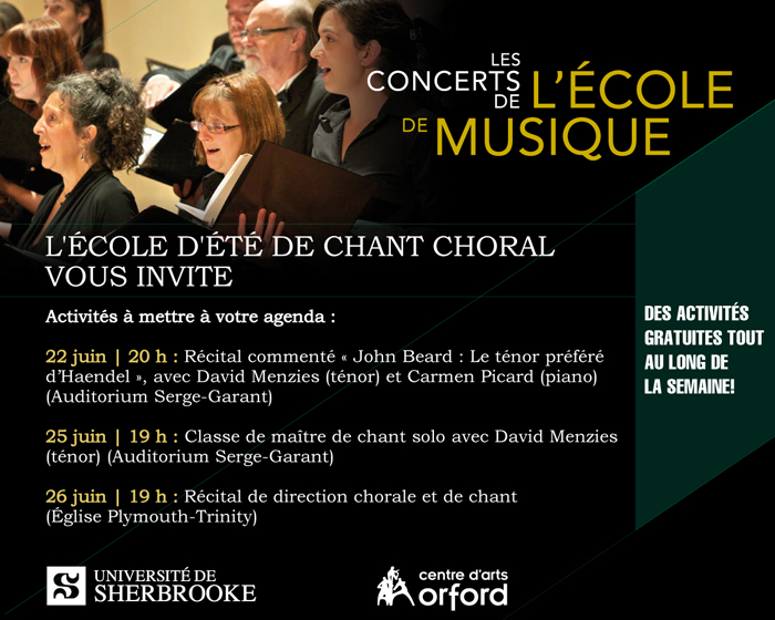 En plus de la préparation intensive du concert gala qui conclura cette édition 2015 de l’École d’été de chant choral, les choristes et chefs de chœurs en formation assisteront ou participeront notamment à des ateliers de direction chorale, au récital commenté « John Beard : Le ténor préféré de Haendel », avec le ténor David Menzies et la pianiste Carmen Picard (22 juin à 20 h), à une classe de maître de chant solo avec le ténor David Menzies (25 juin à 19 h) ainsi qu’à un récital de direction chorale et de chant (26 juin à 19 h). Le public est invité à assister à ces activités, et ce, tout à fait gratuitement.