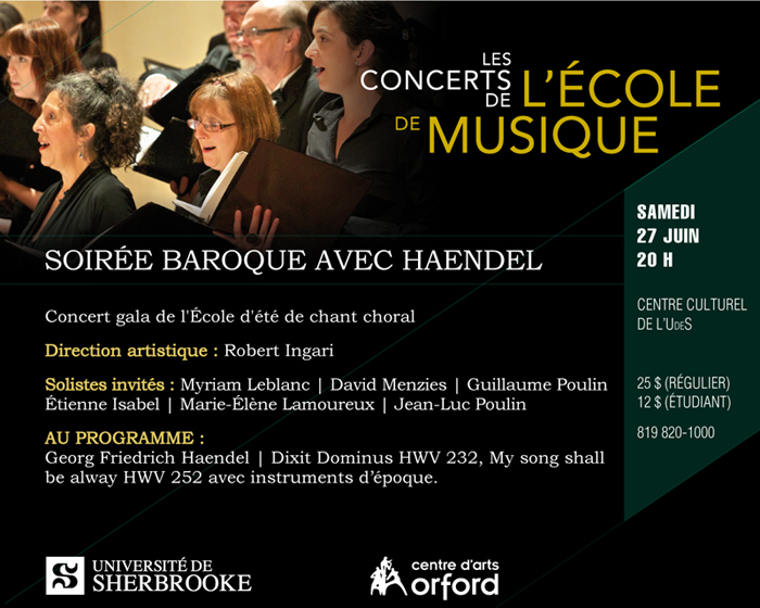 « Pour les amateurs du Messie de G.F. Haendel, ce sera à nouveau l’occasion d’entendre d’autres magnifiques œuvres vocales du grand compositeur de l’époque baroque, explique le directeur artistique Robert Ingari, professeur agrégé à l’École de musique de l’UdeS et responsable de la maîtrise en direction chorale, du programme de chant classique ainsi que de l’École d’été de chant choral. Ce sera l’aboutissement d’une semaine intense où nos choristes et chefs de chœur en formation côtoieront une équipe de musiciens et de professionnels du domaine de la musique vocale. »