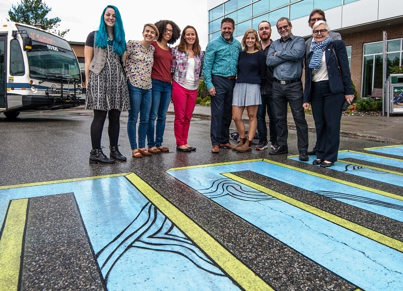 Le lancement de la Semaine de la mobilité durable a aussi été l'occasion d'inaugurer une toute nouvelle traverse piétonne créée par des étudiantes et étudiants du certificat en arts visuels. Intitulé À vos risques et périls, le projet a pour but de faire voir autrement le transport actif par l’ensemble de la communauté universitaire. La traverse, aux couleurs vibrantes, située au cœur du campus, offre aux piétons un parcours inusité qui se joue de nos perceptions.