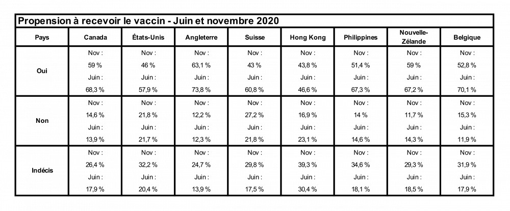 Réalisé dans le cadre d’une enquête internationale dirigée par une équipe de l’Université de Sherbrooke, un sondage effectué en novembre dernier révèle que seulement 59 % des Canadiennes et des Canadiens souhaitent recevoir le vaccin contre la COVID-19, alors que les résultats obtenus en juin dernier pour le même sondage indiquaient que 68,3 % des gens y étaient favorables, une baisse de 9,3 %. Chez les personnes indécises, on note une hausse de 8,5 % entre juin (17,9 %) et novembre (26,4 %). Le transfert s’est donc effectué entre ces deux positions, le taux chez les personnes qui ne veulent pas recevoir le vaccin étant demeuré assez stable.