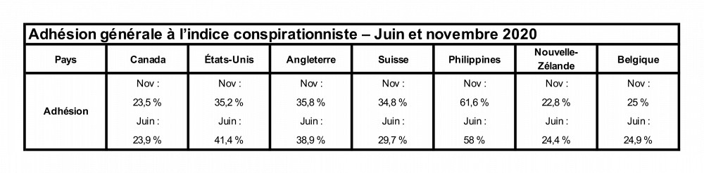 Les résultats du sondage révèlent également que les personnes qui démontrent une forte adhésion à l’indice conspirationniste sont plus nombreuses en novembre qu’en juin dernier. Au Canada, cette adhésion est passée de 6,1 % à 6,9 %. Le même phénomène est observable dans d’autres pays dans le monde.