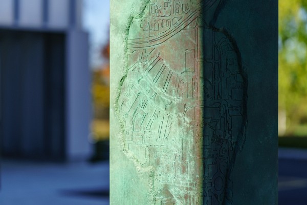 La colonne du centre révèle une carte gravée du campus principal de l’Université de Sherbrooke, une idée venue à l’artiste alors qu’il explorait les définitions de la géomatique.