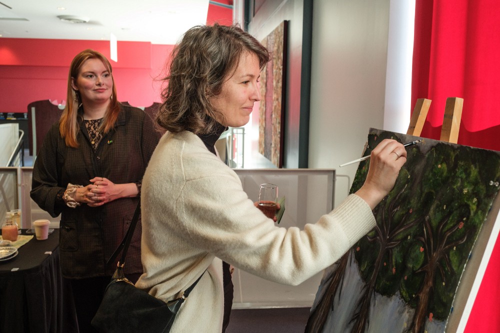À l’aide d’un pinceau, les personnes conviées ont été invitées à laisser leur marque de manière symbolique aux arbres figurant sur la toile.