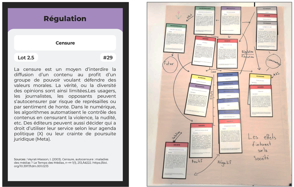 Si les personnes étudiantes peuvent se concentrer sur certaines thématiques, le jeu implique cependant de découvrir les concepts de plusieurs thématiques, afin de renforcer une approche systémique. Chaque équipe étudiante doit composer une murale avec certaines cartes du jeu, en dessinant les relations entre ces cartes. Les murales créées représentent ainsi les pratiques numériques et les préoccupations d’une équipe précise à un moment donné.