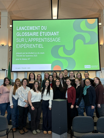 En décembre dernier, les étudiantes et les étudiants du cours TRA300 – Terminologie et traduction spécialisée, donné par AnneMarie Taravella, traductrice agréée, ont présenté leurs travaux ayant mené à la création d'un glossaire sur l'apprentissage intégré au travail.