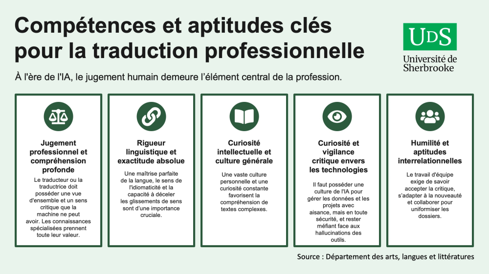 C’est l’un des principaux constats qui se dégagent d’une synthèse réalisée par les responsables du baccalauréat en traduction professionnelle de l'Université de Sherbrooke à la suite d'une consultation auprès de sept employeurs québécois du secteur de la traduction − trois services linguistiques de cabinets de services‑conseils et quatre agences − à l'automne 2025. À la clé : des attentes claires envers les finissantes et finissants ainsi que des pistes concrètes pour arrimer la formation en traduction professionnelle aux réalités du marché.