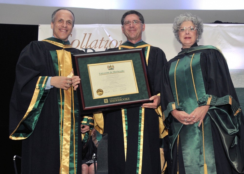 La cérémonie tant attendue a aussi été l’occasion d’honorer deux personnalités bien connues du milieu. Dr Pierre Charron, professeur à la retraite, a reçu le titre honorifique de professeur émérite, la plus haute distinction pouvant lui être attribuée par ses pairs. Au cours d’une conférence qu’il a prononcée le 13 septembre dernier, Dr Charron a partagé avec son audience la passion, la créativité et les valeurs qui l’ont guidé tout au long de sa carrière et qui ont fait de lui un professeur et un clinicien modèle. Sa conférence, intitulée « De Zorba le Grec à Pour la suite du monde - Réflexions sur l'amélioration de l'enseignement de la médecine », retrace la naissance et l’évolution de sa préoccupation pour la professionnalisation des futurs médecins. De par son souci constant de l’amélioration de l’enseignement de la médecine, Dr Charron est l’un des grands pionniers des méthodes pédagogiques qui distinguent si bien la Faculté de médecine et des sciences de la santé de l’Université de Sherbrooke.