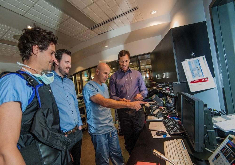 À droite, le Pr Martin Brouillette, en compagnie du Pr Andrew Benko, radiologiste interventionniste qui a pratiqué la première intervention, et de ses deux étudiants au doctorat et co-fondateurs de SoundBite Medical, Steven Dion et Louis-Philippe Riel.