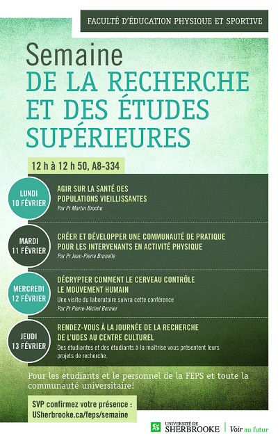Pour conclure cette semaine, la FEPS vous invite à participer à la Journée de la recherche de l’Université de Sherbrooke, le jeudi 13 février au Centre culturel. Des étudiantes et des étudiants aux cycles supérieurs de la FEPS y présentent leurs projets de recherche. Une autre occasion de découvrir une panoplie de possibilités, en plus de pouvoir échanger avec celles et ceux qui évoluent aux cycles supérieurs à la FEPS.