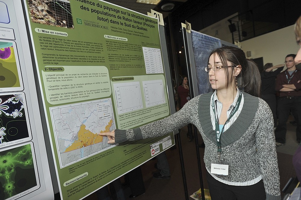 «Ma recherche consiste à déterminer la structure génétique de population du raton laveur dans le Sud du Québec», déclare Héloïse Côté, étudiante à la maîtrise en biologie. Le gouvernement mène des opérations de contrôle pour contrer l'entrée de cette forme de rage au Québec. «En déterminant la structure de la population des ratons laveurs, il sera possible de prédire comment la rage devrait se propager», explique-t-elle.