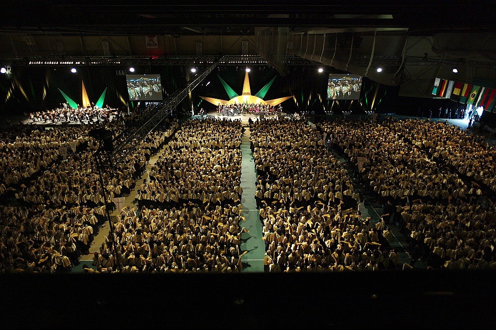 Dans une ambiance de fête, les diplômés agitaient déjà une nuée de foulards verts et or quelques minutes avant le début de la cérémonie principale. Le parterre du stade intérieur, méconnaissable, réunissait quelque 2500 diplômées et diplômés des neuf facultés. L’enceinte noblement décorée de la rose des vents et de la cinquantaine de drapeaux des pays d’origine des diplômés accueillait une célébration solennelle et émouvante. L’émotion et la bonne humeur ont fait un pied de nez aux caprices de la météo : l’énergie et la jeunesse de la promotion 2010 ont su rendre le moment inoubliable.