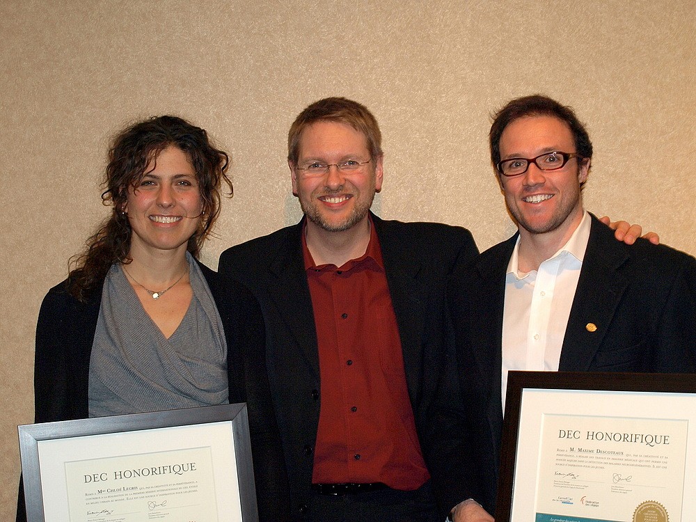 Le professeur Maxime Descoteaux et Chloé Legris, diplômée de l'UdeS et directrice du développement des affaires, Technologies propres et Développement durable pour Sherbrooke Innopole, ont reçut le premier diplôme d'études collégiales (DEC) honorifique décerné au Québec par le Carrefour de la réussite au collégial et la Fédération des cégeps. Ces titres honorifiques leur ont été décernés le 31 mars lors du 7e colloque du Carrefour, qui se déroule à Montréal sous la présidence d'honneur de Pierre Chastenay, directeur général du Planétarium de Montréal et animateur du Code Chastenay.
