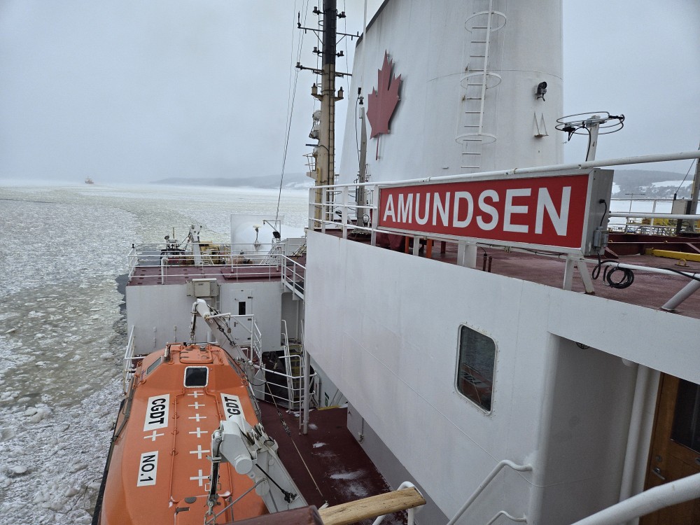 Vers la fin du mois de février, Mohamed monte enfin à bord du navire Amundsen pour se joindre à l’expédition Plaine 2024 - Horizon Glacé, organisée par le Réseau Québec maritime (RQM). Ce brise-glace accueille des scientifiques du RQM, des artistes-photographes ainsi que des personnes étudiantes et professeures de plusieurs universités canadiennes qui conduisent des recherches en biologie et en chimie. Pour Mohamed et Céline Guéguen, cette expédition servait à prélever des échantillons d’eau à différentes stations le long du fjord du Saguenay, pour qu’à leur retour ils analysent en laboratoire la composition et les mécanismes de transport de la matière organique dissoute.