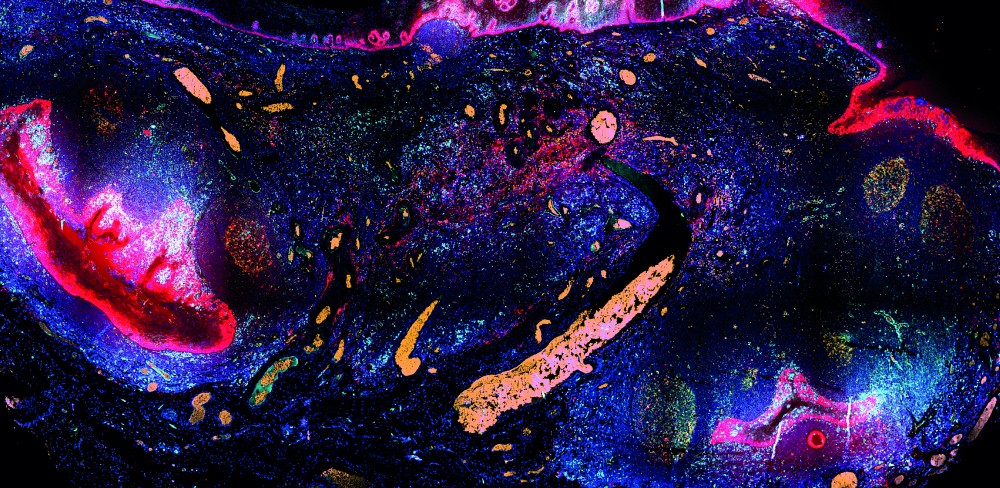 Cette image, qui ressemble à une scène tout droit sortie d’un film de science-fiction, est en réalité une vue au microscope d’un tissu lymphatique prélevé chez l’humain. Un minuscule morceau de notre être, qui dissimule des secrets grandioses.