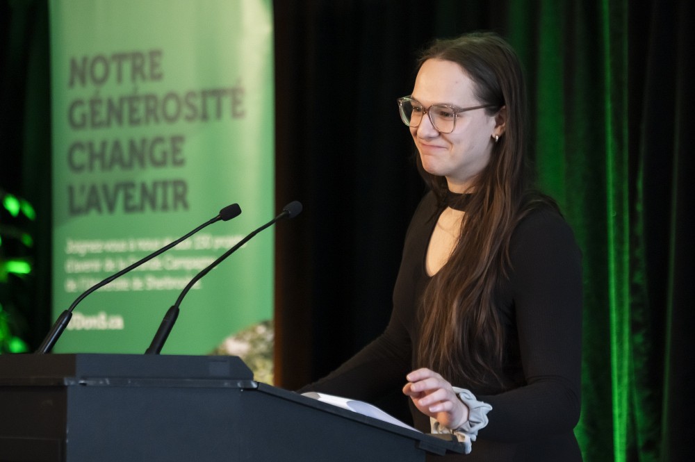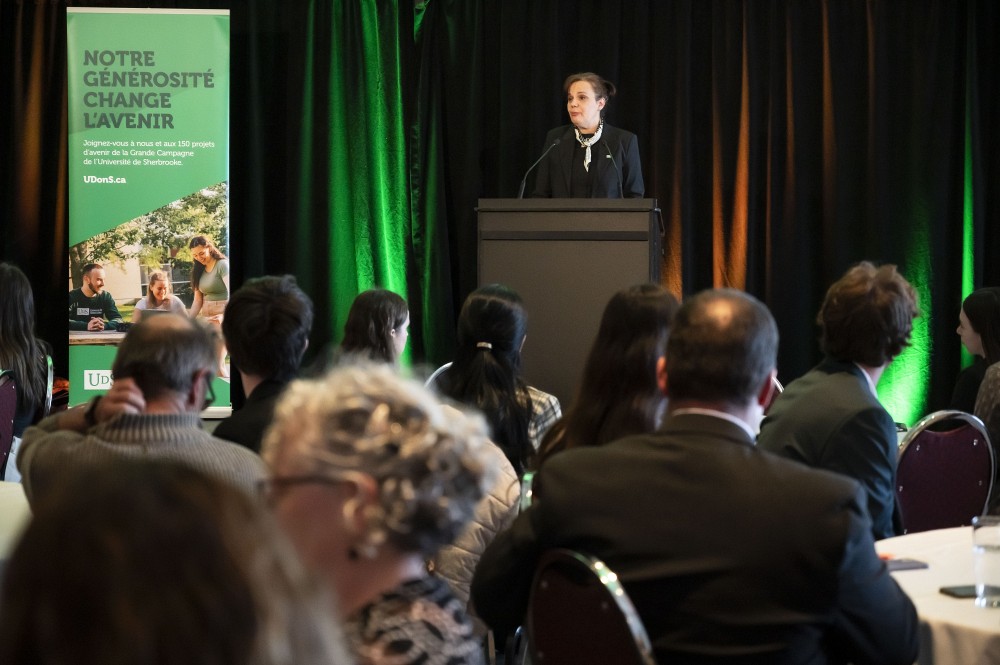 Les convives ont ensuite pu entendre le vibrant témoignage d’une boursière de la Faculté des sciences, qui a livré un message convaincant. « On ne peut surestimer l’effet que l’obtention d’une bourse peut avoir sur le parcours d’une personne étudiante, a expliqué Élodie d’Astous, étudiante prédoctorale en chimie et récipiendaire de bourses pendant son cheminement universitaire, dont la très prestigieuse bourse Vanier. Chaque bourse agit comme une reconnaissance de la qualité de ton engagement comme étudiante et devient ainsi un levier de financement donnant accès à d’autres appuis financiers. C’est un cercle vertueux qui s’enclenche, au bénéfice de la personne, de ses recherches et de toute la société. »