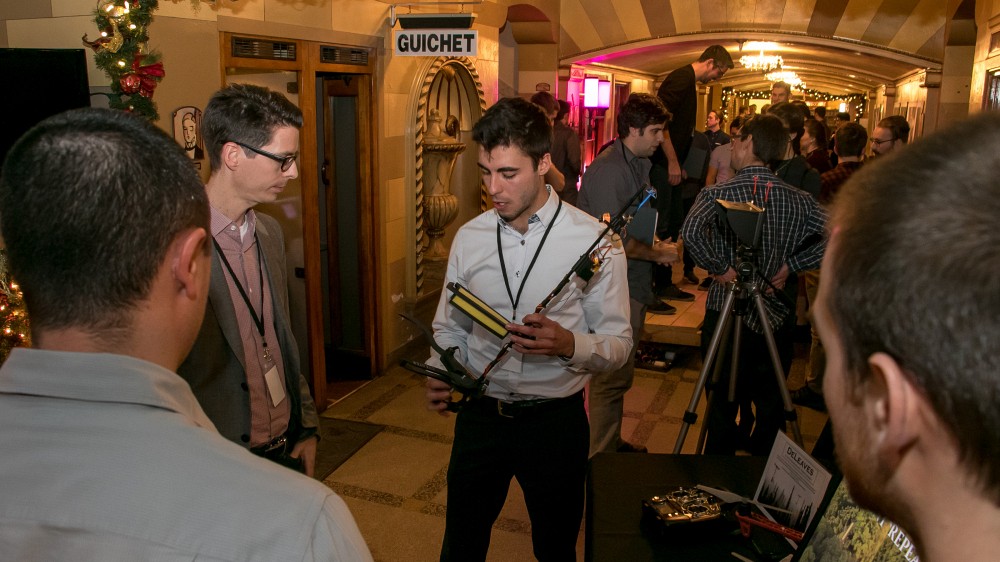Pour une combinaison optimale, l’étudiant à la maitrise en génie mécanique Guillaume Charron et l’étudiant à la maitrise en génie électrique Hughes La Vigne suggèrent un drone de leur invention à autonomie accrue. Contrairement à la concurrence, leur nouveau prototype détecte automatiquement la position des branches, puis assiste le pilote lors de l’opération de récolte.