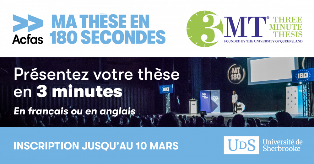 Trois minutes, c’est le temps dont disposeront les doctorantes et doctorants pour présenter oralement une version vulgarisée de leur projet de thèse. Vous aimeriez relever le défi? Les inscriptions débutent maintenant!
