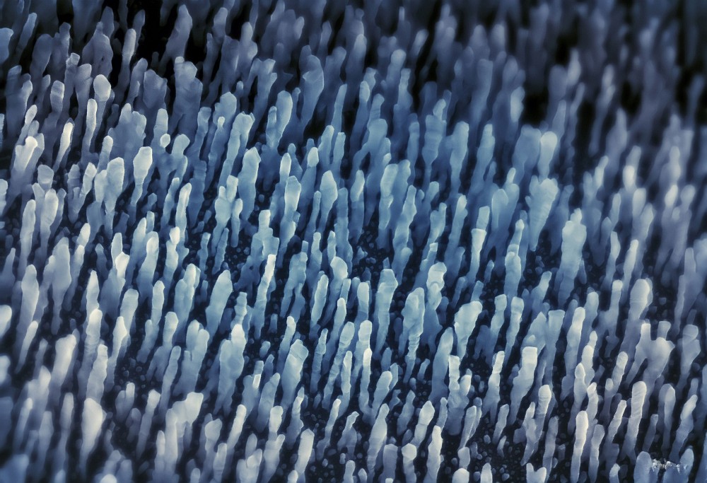 Cette image fractale montre la création du relief sur des circuits électroniques, alors qu’il se présente habituellement en deux dimensions. En fait, l’ajout de « vallons » permet la formation de nouveaux dispositifs électriques. L’image de gauche est composée d’un seul matériau, un polymère, et développée par lithographie (une technique de microfabrication). Ses couleurs dévoilent l’effet de la lumière sur la réflexion des différences d’épaisseur à échelle nanométrique. L’image de droite, quant à elle, est constituée de plusieurs matériaux et gravée par plasma. Des ions bombardent ainsi la surface, ce qui façonne une topographie maîtrisée.