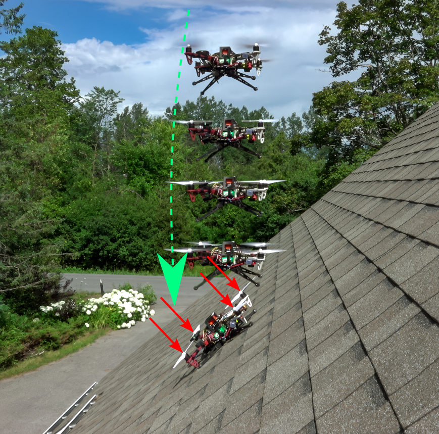 La stratégie proposée permet aux multirotors d'atterrir sur des toits inclinés jusqu’à 60 degrés et sur des véhicules en mouvement.