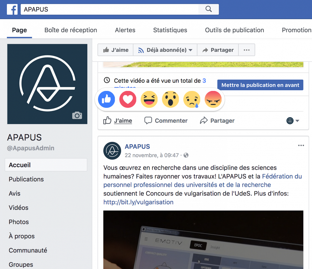 Depuis quelques semaines, l'APAPUS est présente sur Facebook. Nous invitons l'ensemble des membres qui ont un compte Facebook à joindre notre nouvelle page et à partager nos publications. L'objectif de la page Facebook sera de véhiculer des bons coups et des informations générales autour de la vie syndicale. En revanche, l'exécutif compte paramétrer l'utilisation de cette page pour éviter d'amener sur la place publique des enjeux individuels. En ce sens, nous avons adopté une nétiquette que nous vous prions de consulter.
