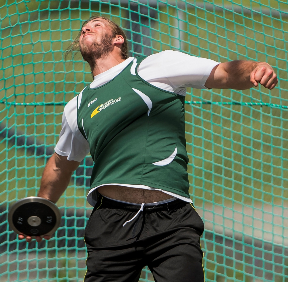 Triple médaillé d'or de l'événement (poids, marteau et disque) tenu à la piste du stade extérieur de l'UdeS les 14 et 15 juin, l'étudiant athlète en kinésiologie a propulsé le disque à 54,89 mètres, et ce, dès son premier tour dans la cage réservée aux compétiteurs. L'ancien record senior québécois dans cette épreuve, qui était détenu jusque-là par Luc Poirier, aura tenu bon pendant 32 ans puisqu'il remontait à 1982...